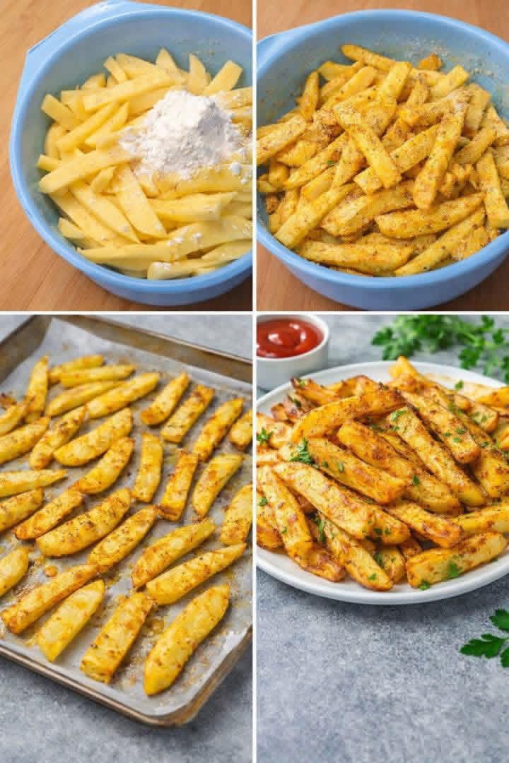 - Coat: Place the potatoes in a bowl. Dust with flour (or cornstarch) and your spices. Drizzle with oil and toss until every fry is evenly coated.